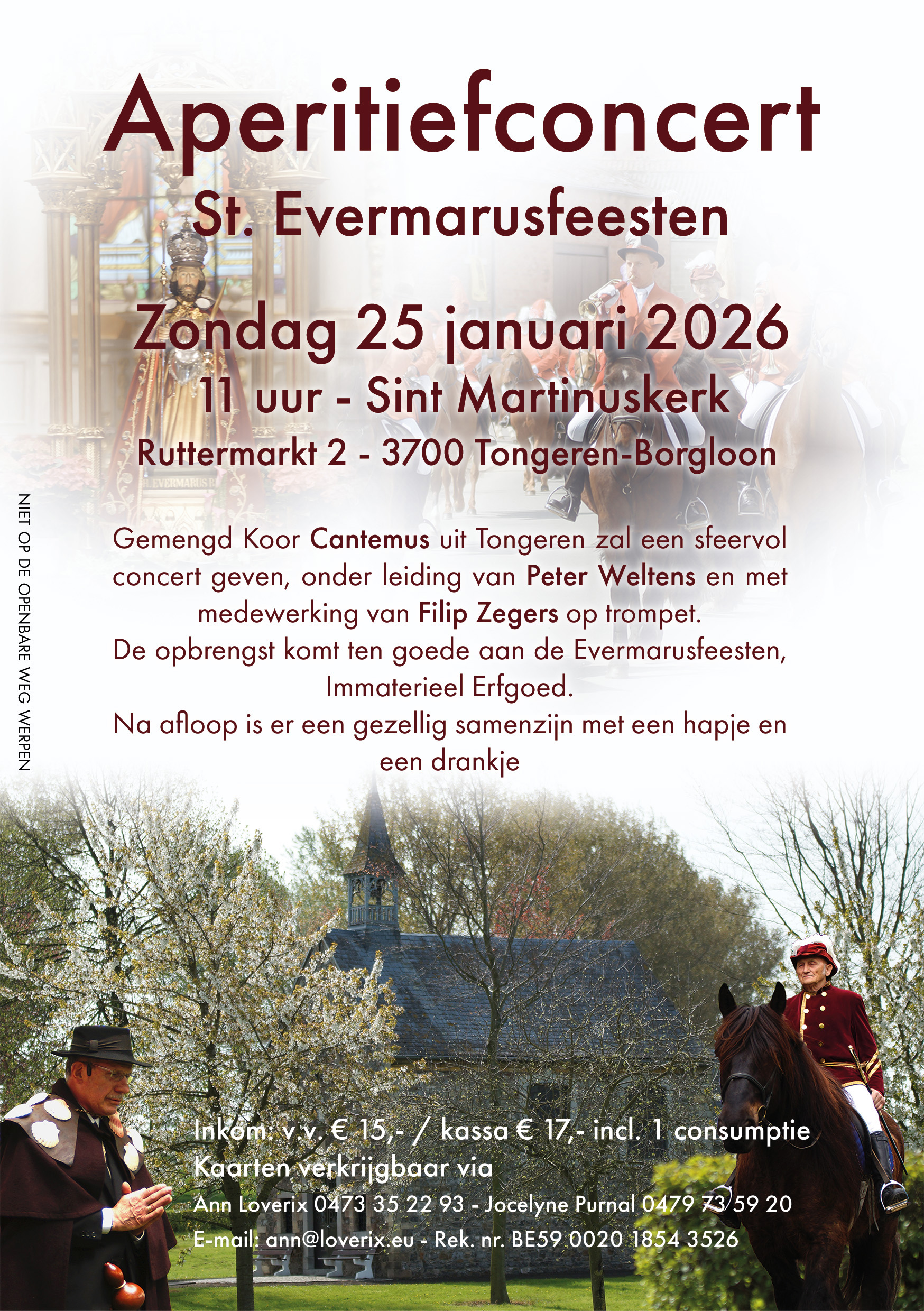 Op zondag 25 januari 2026 om 11 uur verzorgen wij een aperitiefconcert in de St. Martinuskerk te Rutten, waarvan de opbrengst ten goede komt aan de de 1 mei-viering. Kaarten verkrijgbaar via Ann Loverix: ann@loverix.eu